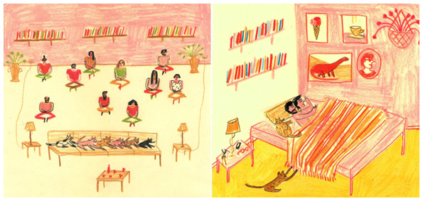 María Luque, una ilustradora argentina a quien sigo en Twitter e Instagram, está haciendo una deliciosa serie de #bibliotecasdibujadas. Ella pide a personas de su entorno, o conocidas por las redes, que le envíen fotos de sus bibliotecas, y a partir de las fotos las dibuja.